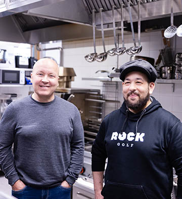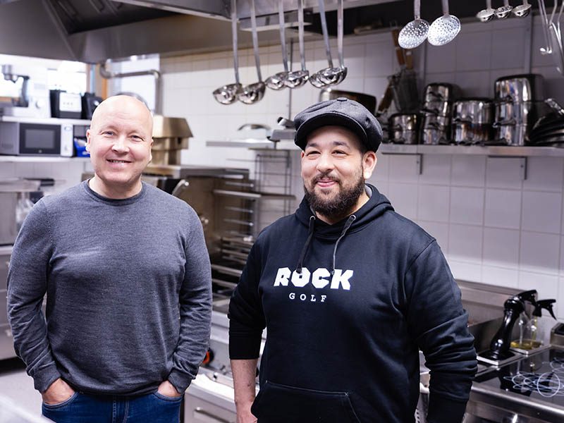 The Rockin ravintolatoimenjohtaja Tero Kuokkanen (vas.) ja keittiömestari Tuukka Kähkönen (oik.) ovat tyytyväisiä Solotopin toteuttamaan kokonaisvaltaiseen keittiösuunnitteluun, jossa asiakkaan tarpeet ja keittiön käytettävyys olivat lähtökohtana.